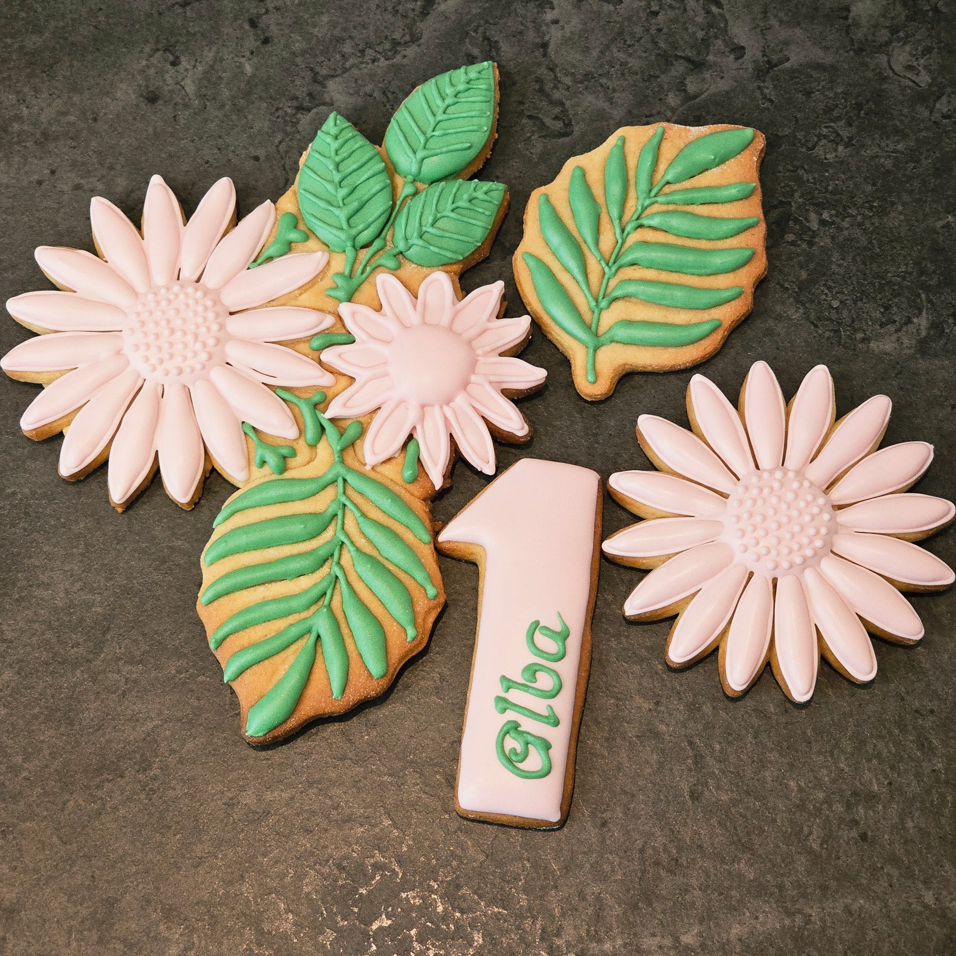 ✔ Biscuits fleurs et feuillage rose pâle et vert